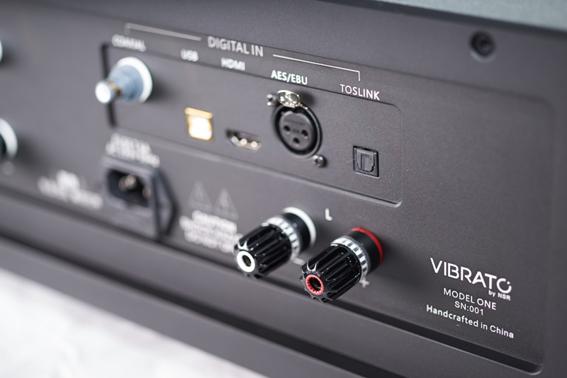 Vibrato 的创业作Model One 数字合并式功放,以后其他产品都是在其基础上延伸或强化而来。它没有模拟输入,但支持多种数字音频接口输入,包括HDMI、AES/EBU、S/PDIF 同轴、Toslink 光纤, 以及支持异步的32bit USB 高速接口。Model One 采用XMOS Natve DSD 技术方案,透过USB2.0 接口支持最高32bit 384kHz 取样频率;支持Windows 下的Audioclass 2.2 异步驱动版本的原生Native DSD 格式;支持DoP 模式;支持DSD64 以及DSD128 和DSD256 格式;PCM 可以支持到32bit/384kHz 的最高格式,同时支持24bit/352.8kHz 的DXD 格式音频。Model One 采用了二枚美国ESS 的SABRE ES9018 解码芯片,等于每声道8 颗DAC 并联。机内有三组1PPM 的温度自动补偿高精度晶振,左右声道的解码芯片各一个时钟,另外有一个工作频率较高的参考时钟,让整体失真控制在非常非常低的水平。虽然是合并功放,数码部分THD仅为-108dB(0.00036%), 噪音-130dB, 信噪比126dB,动态范围130dB,这可是非常惊人的成绩,足以秒杀许多Hi-End 解码器!