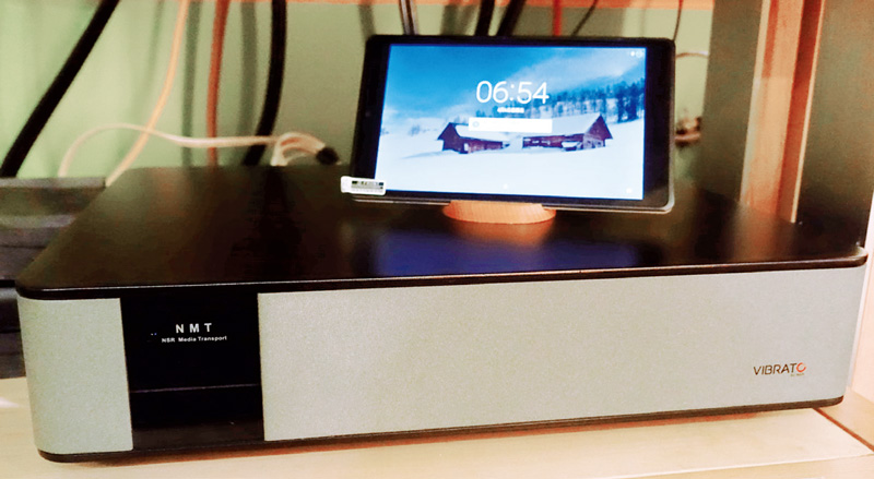 然后是Vibrato NMT 数字播放器,小学生等级的操作界面让人好气又好笑,但真的好用,即使发烧李这样上了年纪的前辈也能轻易上手。由于没有大尺寸的显示屏,NMT 最早附赠一个平板,后来好像改成一个外置小屏幕,总之拿着苹果遥控器就能简单操作发出声音,做到了“我傻瓜没关系,它聪明就好”。对我来说NMT 最大的价值有二个,一是可以硬解DSD iso 文件,完全符合中国发烧友需要;二是带有HDMI 接口,透过一部HDMI 2.0 规格( 频宽18GHz)的矩阵交换器,我可以让NMT 播出的信号同时供给Model One 合并功放、NDP 前级/ 耳放,以及多声道系统使用,一举多得。