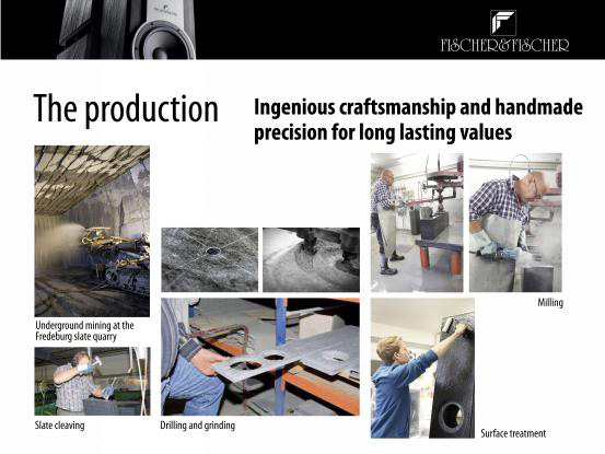创始人Thomas Fischer的家族在德国经营一个板岩矿场,拥有最优质的板岩石材,Thomas是一个音响爱好者,多年的发烧友生涯深知木制箱体始终避免不了声音的共振影响,其他的材料如金属或水泥又过于刚硬,而板岩属于沉积岩,具有层状或片状的结构特性,还有自身质量大的特点,可以让单元有一个坚固的发声平台,是制作音箱的绝佳材料,让板岩与音响结合真是一个天才的创意,在得天独厚的优势以及对音响的无比热情之下,F&F品牌就这样诞生了!