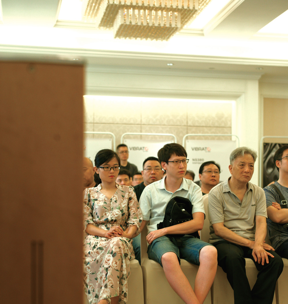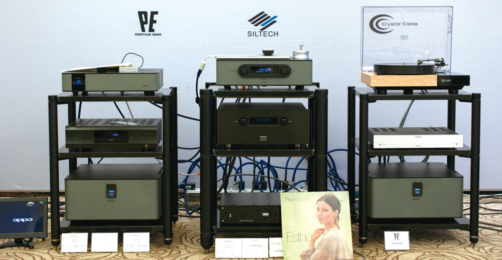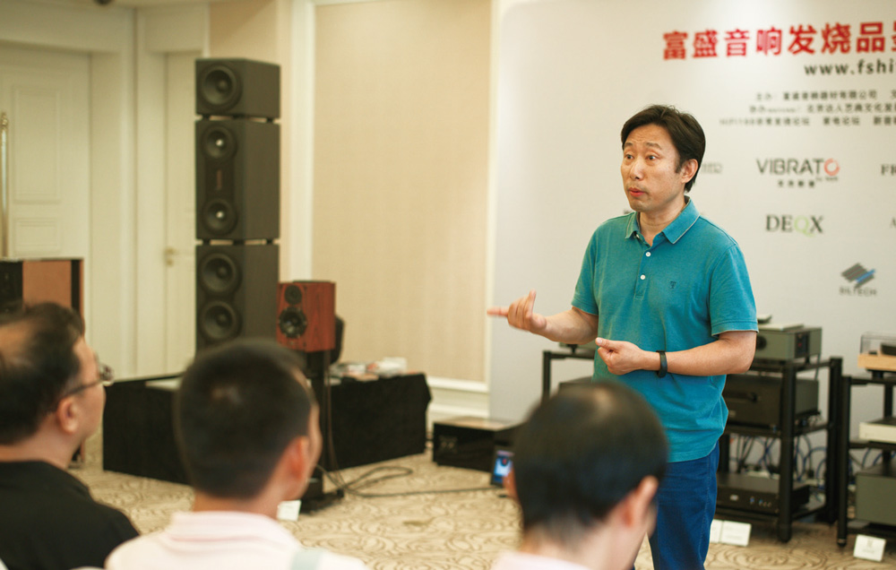 为了安排两天的演示, 主办方出动了由德国Fischer&Fischer 炭质板岩旗舰音箱、德国Audionet、文杰影音VIBRATO 的NSR 高清格式的数播、前后级、黑胶唱盘和NSR 重型机架脚架的豪华器材。7 月21 日周六上午,一早就有很多烧友来到演示现场。而上午的演示和讲解由富盛音响总经理和文杰影音总设计师峰哥来担任,他从技术到产品到音乐的播放,精彩的内容,吸引大家不断的提问和互动。