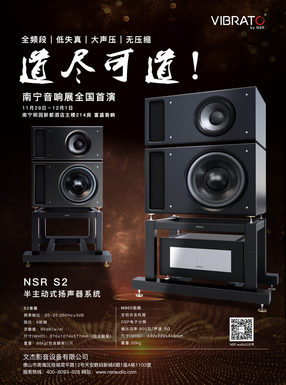 NSR最新于2019广西南宁(东盟)国际视听展正式推出S2主监听扬声器系统!由一个12寸独立箱体构成的中低音,和8寸同轴单元组成模拟点声源设计,相位极端准确,真实还原录音作品里的现场信息。和S3设计有所不同,为了达到更好的中场监听特性,8寸同轴单元的分频点比S3更低,让12寸单元只负责超低频段,近距离聆听声音更准确!所有单元均使用超大型铷铁硼磁路,每个S2拥有超过两千瓦的瞬间功率承载力,让毫无压缩的音乐动态得以完美再现! 航天级铝材以0.02mm精度CNC加工而成的无谐振脚架,让立体声像稳如泰山,定位精准。900瓦主动式低频后级设计,内置DSP低频分频和管理系统,可完美配合使用环境再现平直到20hz无衰减的超低频段。全独立箱体,无应力超厚铝合金三文治结构前障板,超过120分贝持续声压超低失真声压输出。静可抚琴奏高山流水,动能再现电音响宴! 君臨天下之氣勢,雷霆万钧,绕梁三日。NSRAUDIO S2中近场主监听系统 道尽可道!