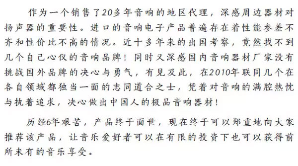 作为多年的音乐与音响的爱好者,自己选择东西一定是万里挑一了。因为做音响生意的很难有富豪般的收入,但是过手器材很多,难免十分挑剔。从考察一个产品的设计理念、再到产品完成度,最后到生产装配的工艺细节,想必只有足够年头的音响人,最会“算计”着给自己添置什么样的家当。