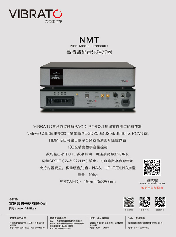 VIBRATO NMP是一台划时代的高格式数字文件播放机,采用了工业级视频压缩和分发服务器级别的架构和CPU,让NMP成为全球首台可硬解DST SACD 镜像压缩文件及各种高格式数字文件的播放器。